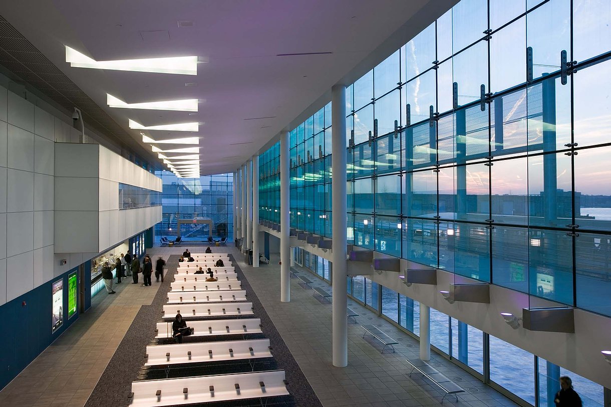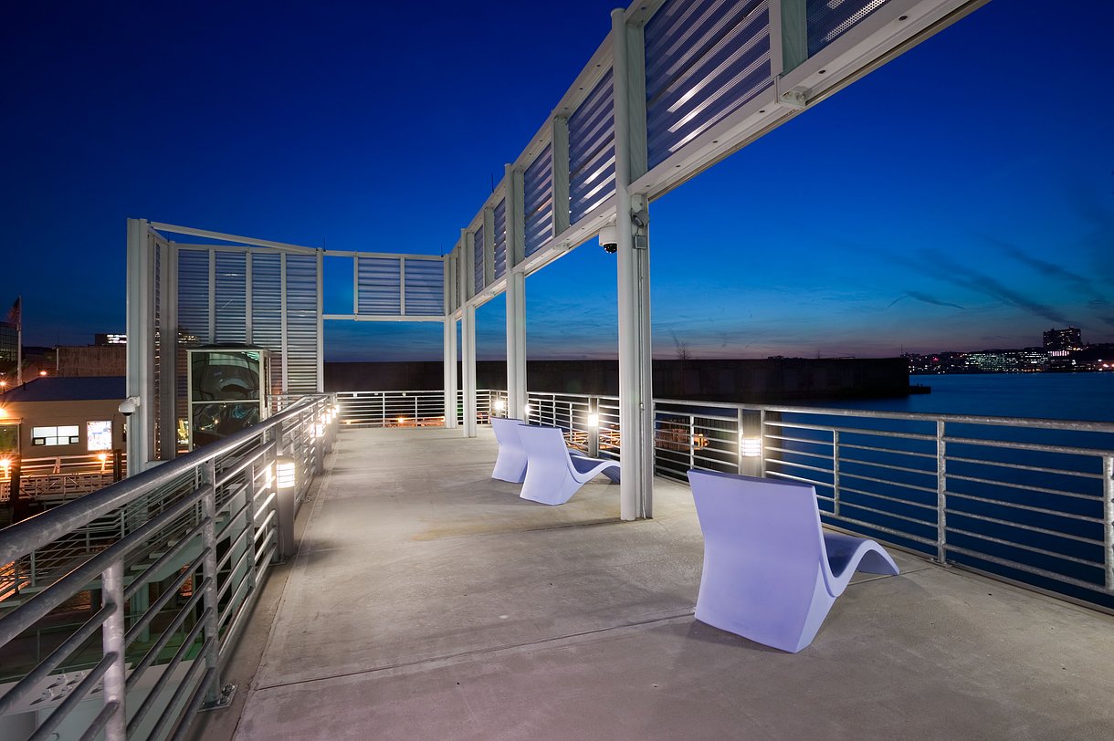 This visually compelling building. which has won architectural and lighting awards and graces the cover of this month’s LD+A magazine, marks the entry to midtown Manhattan for passengers on NY Waterway.
