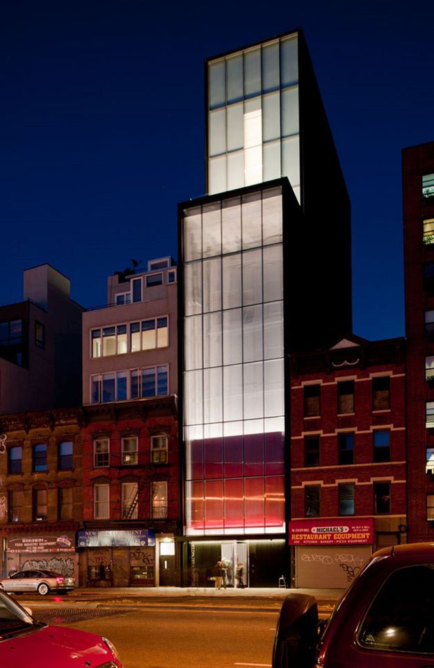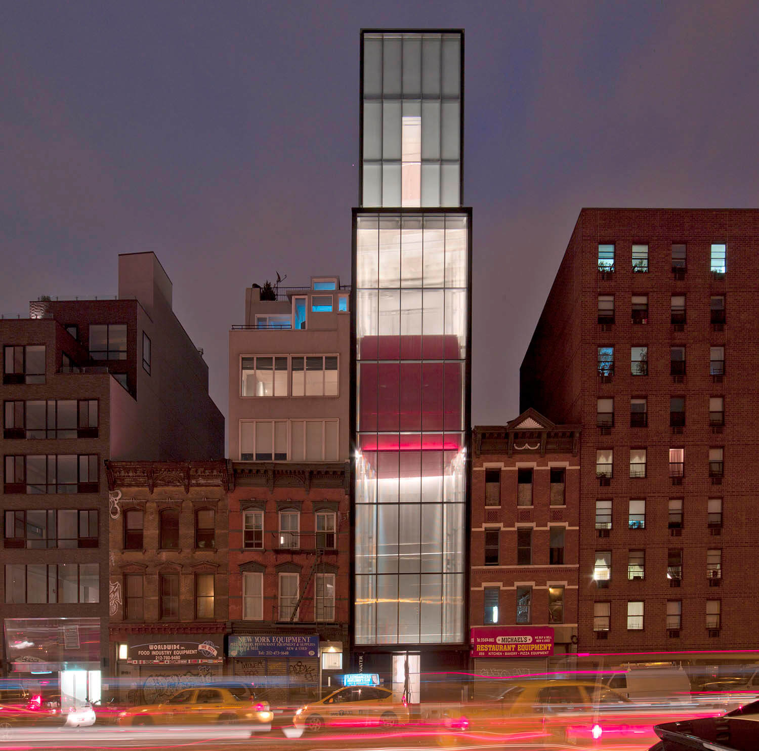 Amidst the contrasting new and old in the re-emerging Bowery, the Sperone Westwater Gallery at night presents a glowing shaft of light, punctuated by a hovering red form that elevates behind the glazed façade.