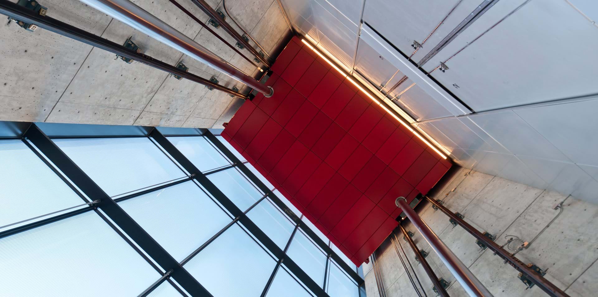 Amidst the contrasting new and old in the re-emerging Bowery, the Sperone Westwater Gallery at night presents a glowing shaft of light, punctuated by a hovering red form that elevates behind the glazed façade.