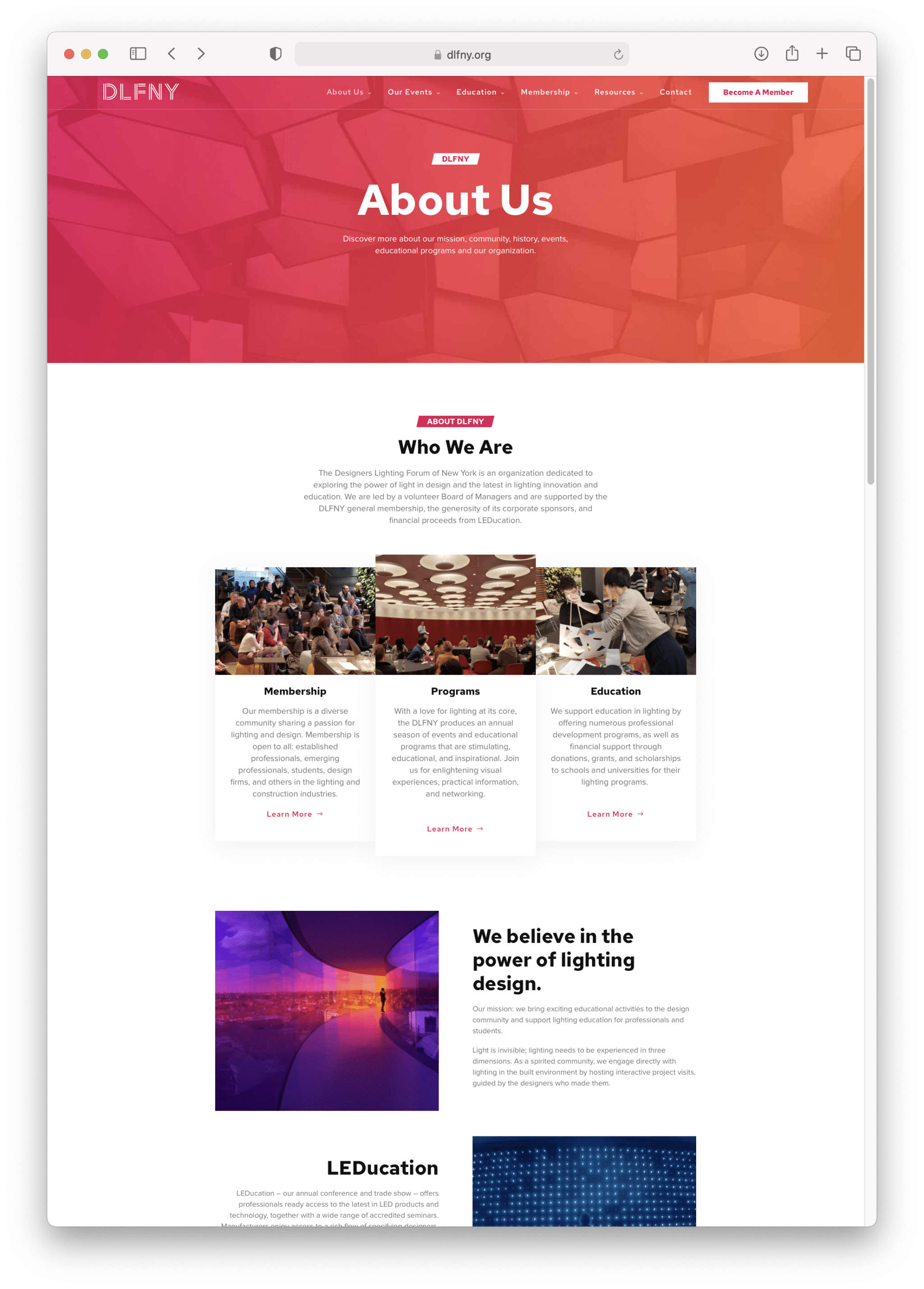 The DLFNY is proud to launch this new and improved website. The goal of the redesign is to provide an even better resource for our members and the lighting community as a whole. As always, we will continue to create unique, engaging events that explore lighting design and offer professional knowledge, education, and networking opportunities in the lighting community. We hope our members and other visitors find the new website to be easier to navigate. We also hope that you find the colorful rebranding and contemporary features a refreshing start to 2021!